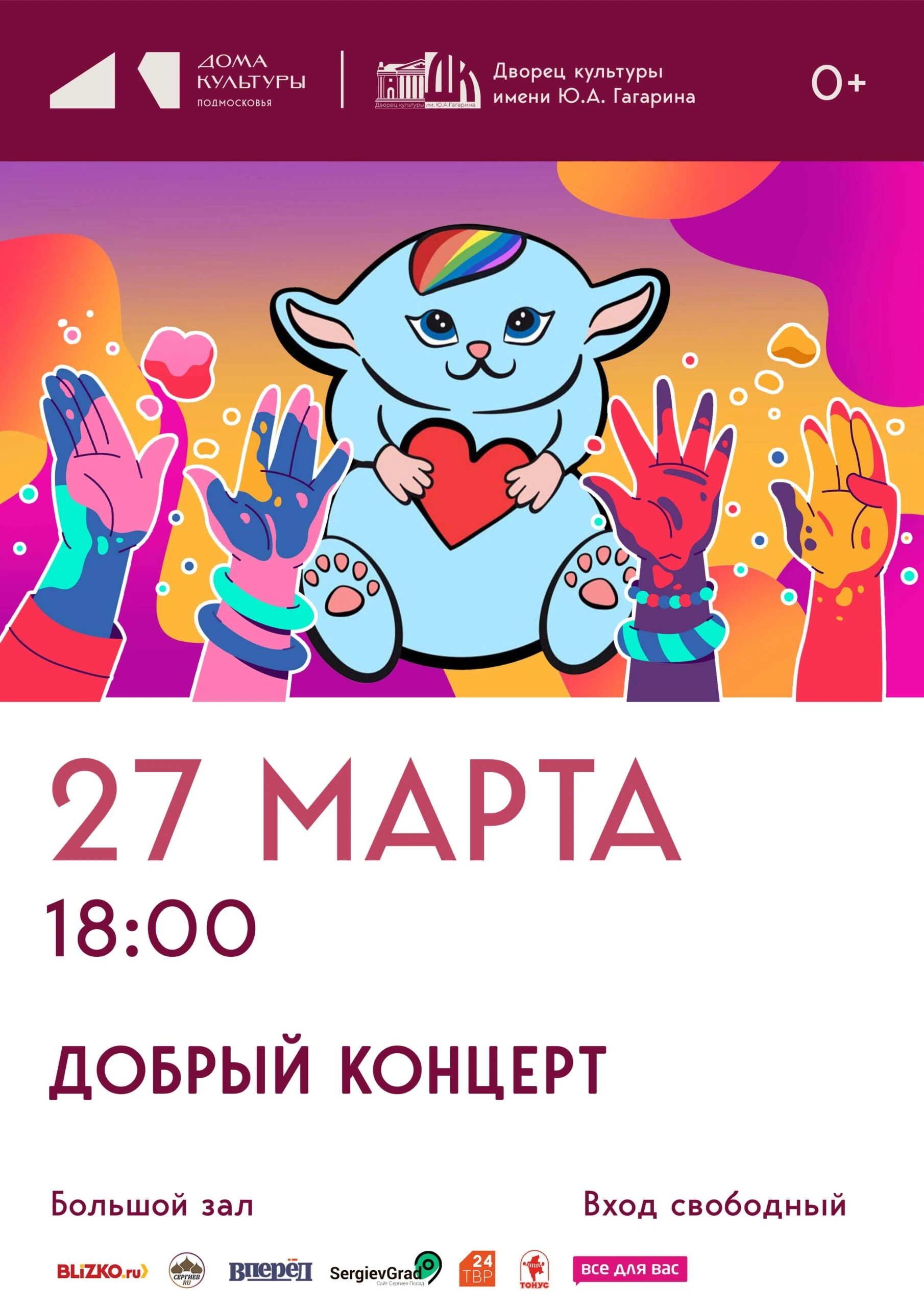 Приглашаем вас принять участие в благотворительном проекте «Добрый концерт», который состоится 27 марта в 18:00 в большом зале «Дворца культуры имени Ю.А. Гагарина». Цель мероприятия — поддержка Центра семей с детьми с инвалидностью «Время надежды».