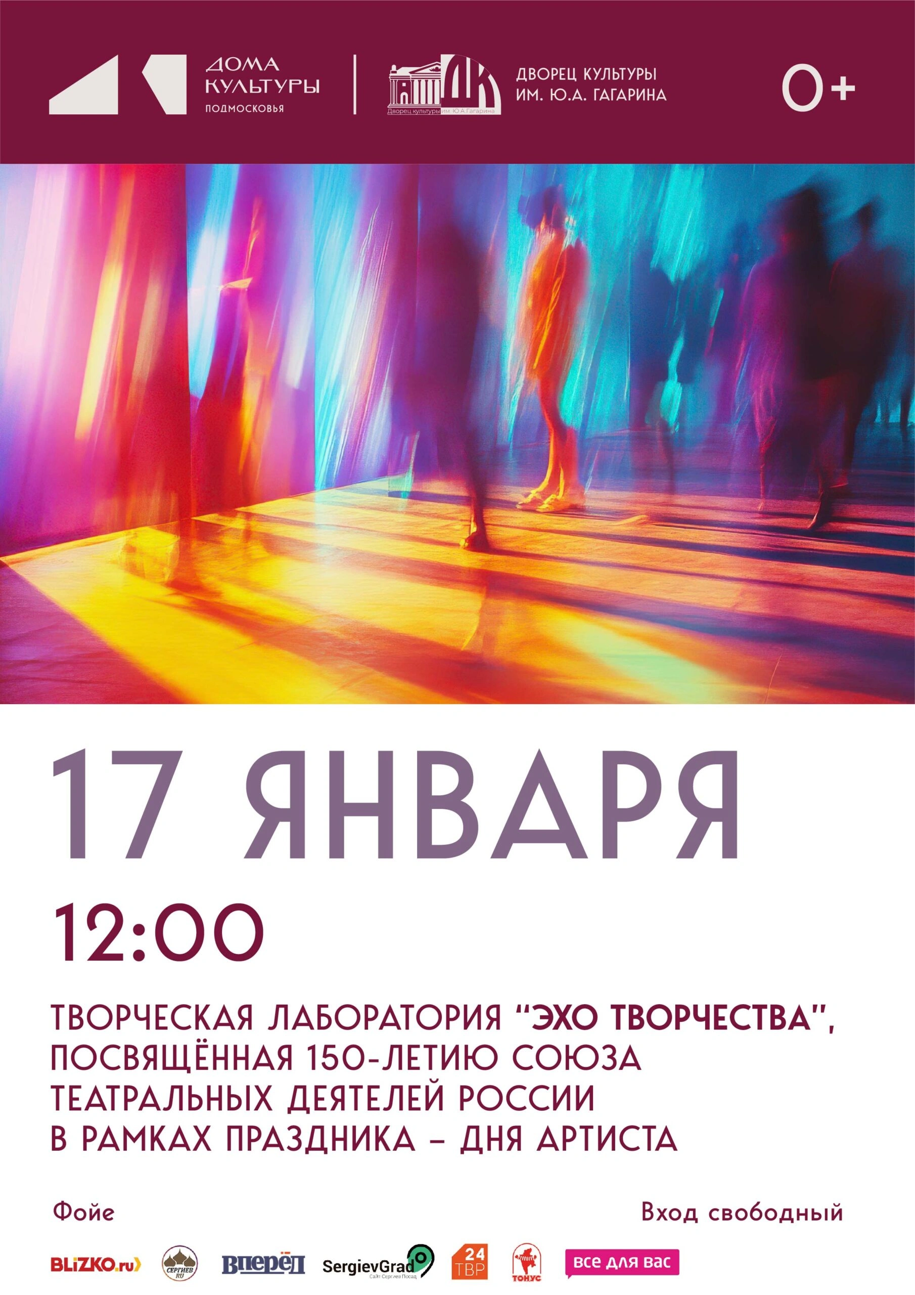 Приглашаем вас на Творческую лабораторию «Эхо Творчества», которая состоится 17 января с 12:00 до 16:00 в МБУК «ДК им. Ю. А. Гагарина». Это мероприятие приурочено к 150-летию Союза театральных деятелей России и будет проходить в рамках праздника - Дня артиста.