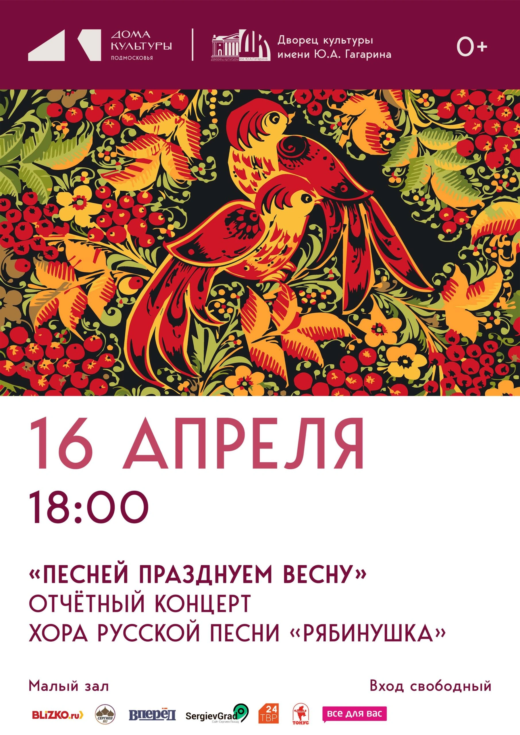 16 апреля в 18.00 хор русской песни «Рябинушка» соберет своего зрителя – любителей народной фольклорной музыки – в малом зале Дворца культуры. В программе концерта песни народов России. Зрители услышит не только новые произведения в исполнении хора, но и полюбившиеся народные песни в современной аранжировке. Также свои творческие номера представит ансамбль «Пташки».