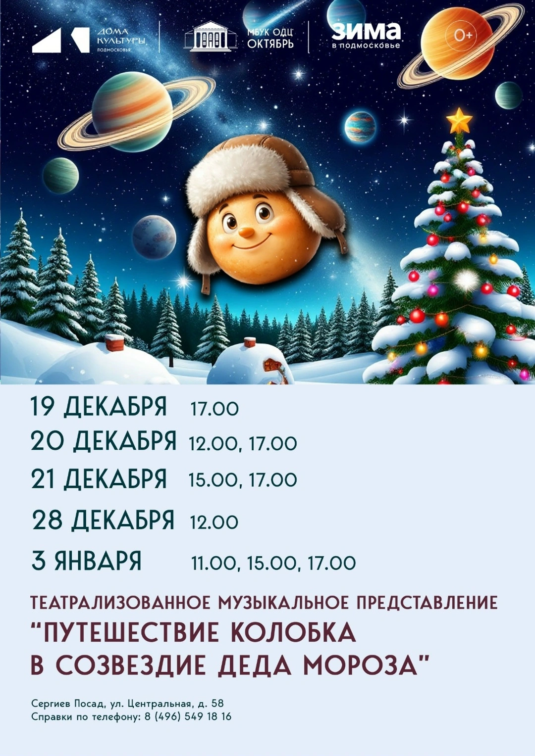 Каждый ребёнок мечтает стать космонавтом! И вот однажды подняться выше облаков задумал круленький, румяный Колобок! Он засмотрелся на солнышко и тоже захотел стать звездочкой, чтобы согревать всех вокруг. Давайте и мы отправимся вслед за Колобком в космическое путешествие, но не простое: наш путь будет к Созвездию дедушки Мороза! Вас ждут незабываемые приключения на волшебных планетах, игры и новогоднее веселье со сказочными героями! Ждём вас, наши юные зрители, на космической станции ОДЦ "Октябрь"!