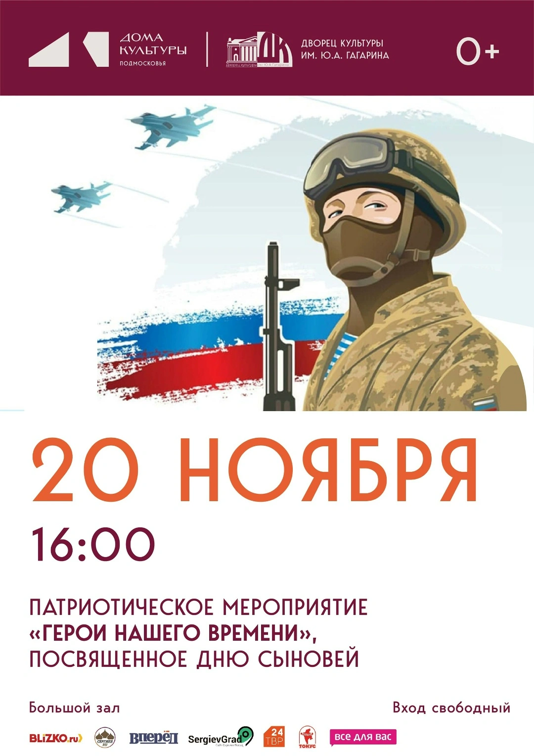 Приглашаем вас на уникальное мероприятие "Герой нашего времени", посвященное Дню сыновей, которое состоится 20 ноября в " ДК им. Ю. А. Гагарина". С 15:00 в фойе будут работать тематические интерактивные пространства, где каждый сможет погрузиться в атмосферу патриотизма и уважения к тем, кто служит примером для подражания. В 16:00 в большом зале пройдет концертная программа с участием талантливых коллективов и сольных исполнителей Сергиево-Посадского городского округа. Мы обещаем вам незабываемые музыкальные номера и яркие выступления, которые создадут праздничное настроение и подчеркнут важность этого дня. Не упустите возможность стать частью этого значимого события, которое объединит нас в любви и уважении к нашим сыновьям! Ждем вас!