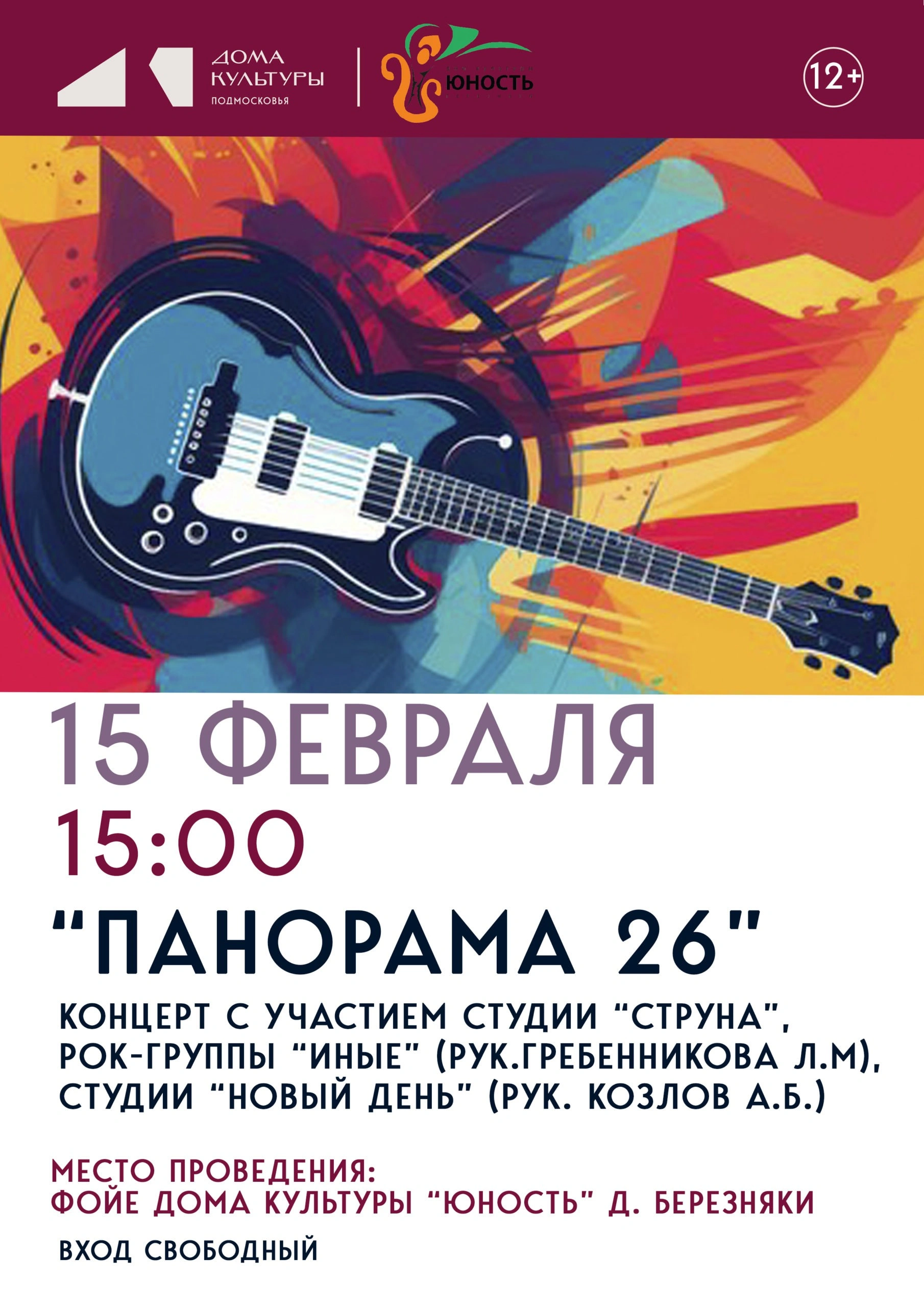 Приглашаем всех на рок-концерт начинающих музыкантов «Панорама 26», который пройдет в фойе Дома Культуры «Юность» д. Березняки 15 февраля в 15:00.