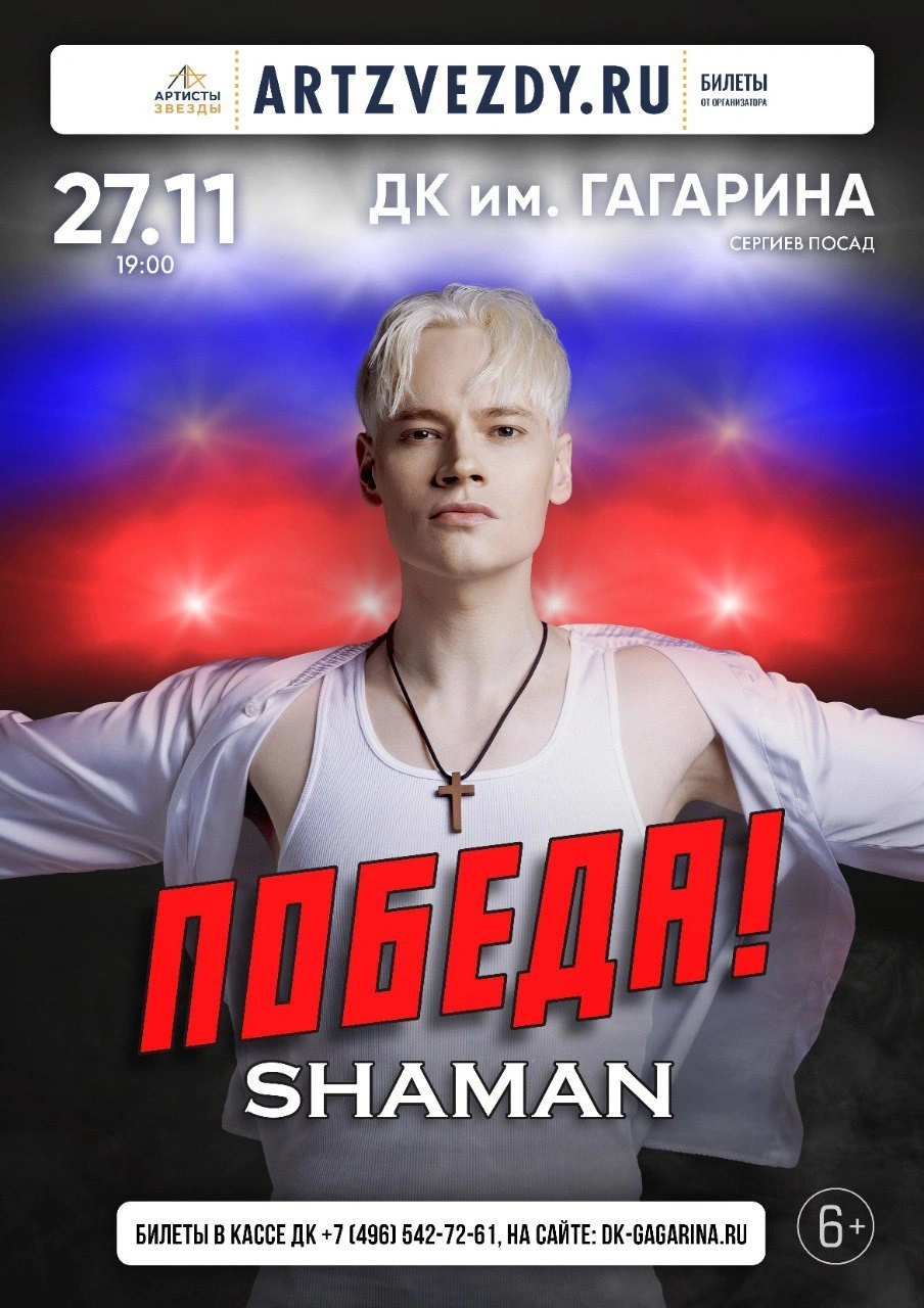 Заслуженный артист России и автор всенародно любимых хитов SHAMAN представляет грандиозную «Победу!». Так называется новая концертная программа знаменитого певца и большой гастрольный тур, в рамках которого уже запланировано свыше 100 выступлений в различных регионах России, включая города Новороссии. В новую концертную программу, премьера которой состоялась на Красной площади в День российского флага, вошли свежие песни, специально написанные музыкантом для «Победы!», и золотые хиты — «Встанем», «Я русский», «Моя Россия» и другие, уже полюбившиеся миллионам россиян композиции. SHAMAN уверен — «Победа!» станет судьбоносным событием, способным изменить ход истории: «Я хочу вдохновить всю Россию, всех — и в тылу, и на передовой. Мы поедем за ленточку, в зону СВО, к нашим бойцам, к нашим героям. Мы объедем всю нашу необъятную страну. Сделаем всё для победы, а победу — ещё ближе!».Стоимость билета: 3 000₽ — 10 000₽
