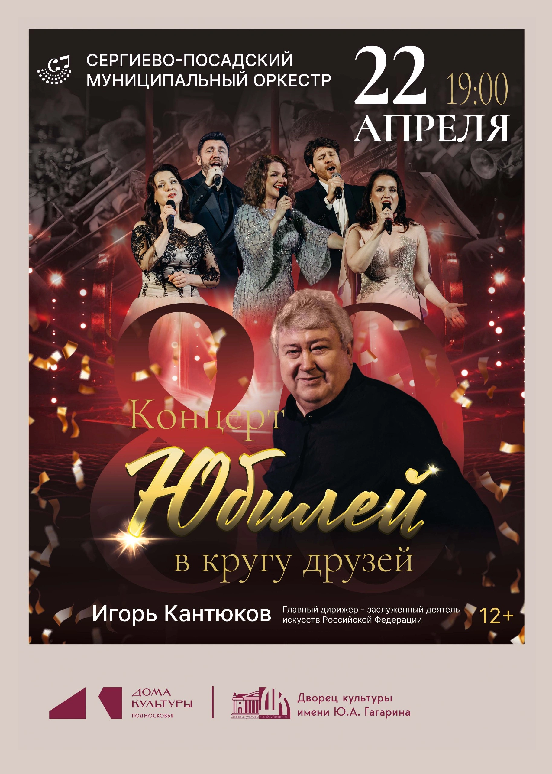 Программа Сергиево-Посадского муниципального оркестра «Юбилей в кругу друзей» приурочена к юбилею главного дирижера оркестра, прекрасного музыканта, композитора и аранжировщика, заслуженного деятеля искусств Российской Федерации Игоря Васильевича Кантюкова, чей талант признан музыкальным сообществом всей страны. Этот удивительный концерт соберет в Большом зале Дворца культуры им. Ю.А Гагарина своих лучших друзей — блистательных артистов и преданных слушателей!