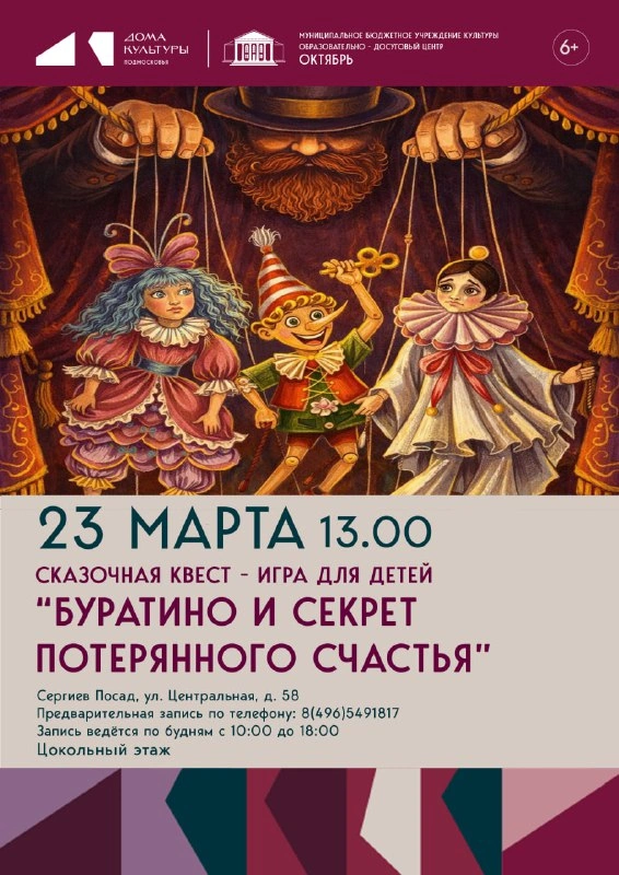 Сказочная квест-игра «Буратино и секрет потерянного счастья» — увлекательное театрализованное приключение для детей, созданное по мотивам сказки Золотой ключик, или Приключения Буратино. Участники вместе с Буратино отправятся в волшебное путешествие, чтобы помочь вернуть утраченное счастье и раскрыть тайну, скрытую в сказочном мире. По сюжету квеста в сказочной стране произошло невероятное событие: Карабас -Барабас совсем растерял своё счастье и решил забрать его у всего сказочного мира, Буратино и его друзьям предстоит оставить злодея. На пути участников ждут встречи с Мальвиной, Пьеро, Дуремаром и Черепахой Тортилой, каждый из которых приготовил свои задания и загадки. Квест проходит в формате интерактивной театрализованной игры: дети перемещаются по тематическим локациям, выполняют творческие и игровые задания, участвуют в интерактивах и собирают подсказки, ведущие к главной тайне. Особое внимание уделяется атмосфере сказки — ярким костюмам, музыкальному сопровождению и живому общению с персонажами. Игра направлена на развитие командной работы, воображения и эмоциональной вовлечённости детей. Финалом квеста становится открытие главного секрета: настоящее счастье рождается из дружбы, взаимопомощи и веры в добро.