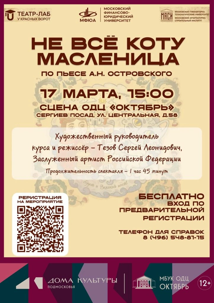 В рамках празднования Всемирного Дня театра Московский финансово-юридический университет МФЮА совместно с театром «У Красных ворот» при Московской академии современного искусства МГТУ-МАСИ приглашает учащихся школ, а также студентов колледжей и вузов Сергиево-Посадского городского округа на спектакль «Не всё коту масленица» по пьесе А.Н. Островского.