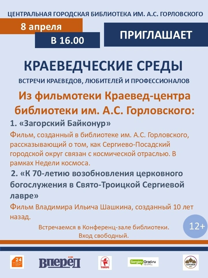 1. «Загорский Байконур» - фильм, созданный в библиотеке им. А.С. Горловского, рассказывающий о том, как Сергиево-Посадский городской округ связан с космической отраслью. В рамках Недели космоса.